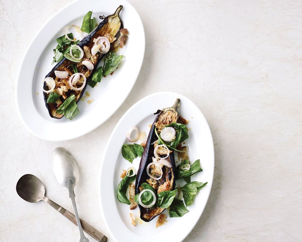 Rør olie, salt, friskkværnet peber og saft og fintrevet skal fra citron sammen til en vinaigrette. Skær brød og kyllingeskind i mindre stykker. Fordel vinaigrette, skind og brød ud over auberginerne. Hak basilikum groft, og skær skalotteløg i tynde ringe. Drys over retten, og spis den som en forret eller en let frokostret. Du kan også servere de bagte auberginer som tilbehør til stegt eller grillet kylling eller fisk.