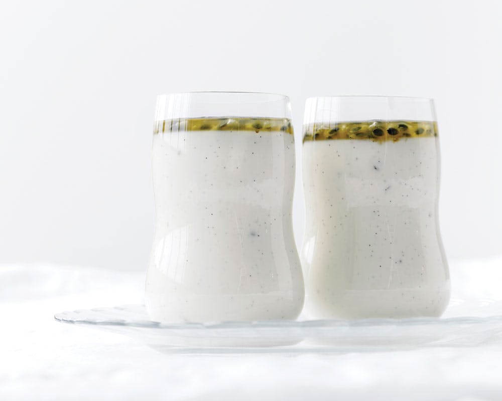 Halvér passionsfrugterne, og skrab kødet ud. Si kernerne fra, og kom saften i en gryde sammen med sukker. Lad det koge lidt ind, og lad siruppen køle af i køleskabet. Fordel siruppen over yoghurt-pannacottaen lige før servering.