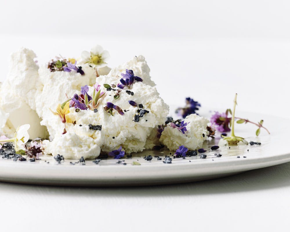 Tag 4 dl af friskosten fra til anretningen, og rør lidt i den, så den bliver blød og får en cremet konsistens. Anret osten på et fad eller på fire tallerkener, og drys med blomster og salt. Servér med det samme med godt brød, knækbrød eller ristet rugbrød til.'