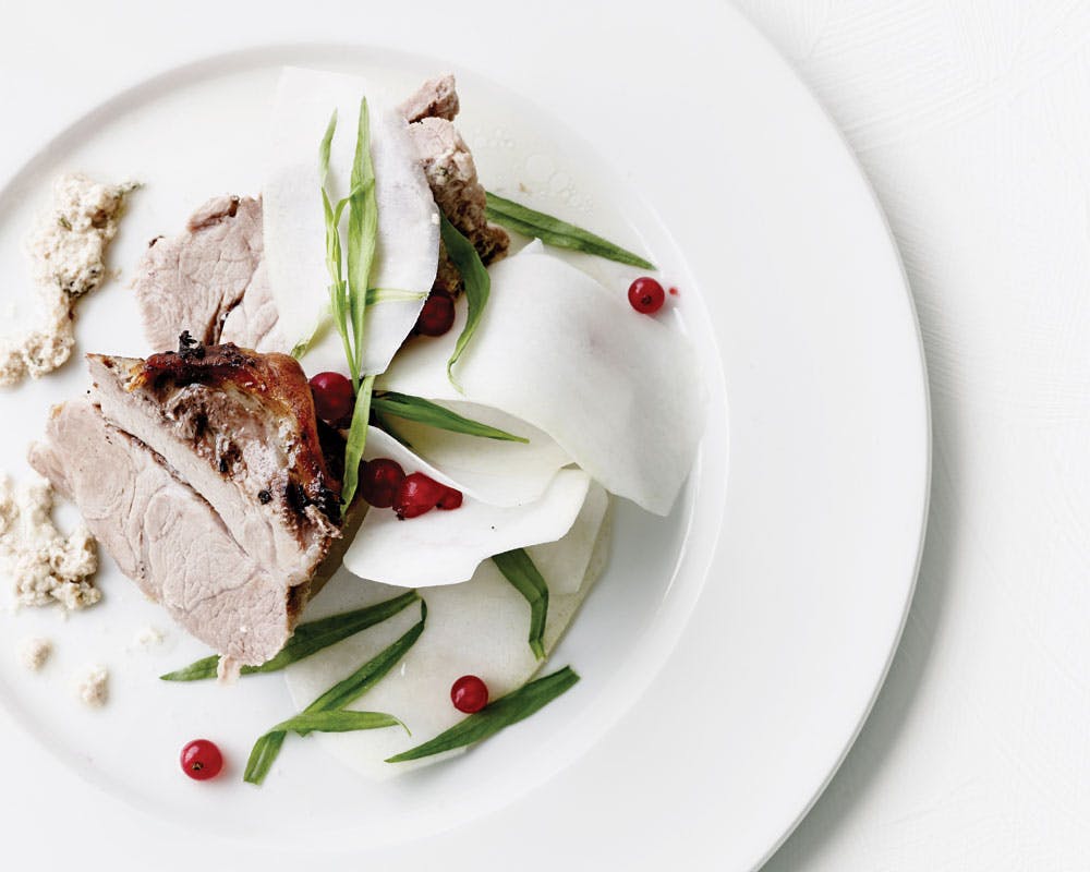 Tag nakkekammen op af gryden, og lad den trække i 10-15 minutter, før du skærer den i grove stykker og serverer den med lidt af skyen og ’mælkeklumperne’ og en sprød salat af glaskål, ribs og estragon og evt. godt brød til.