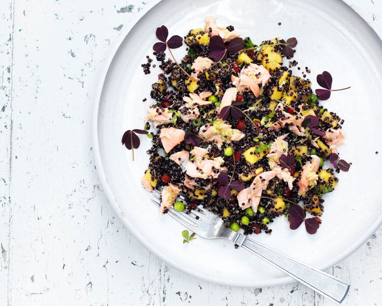 Servering: Fordel laksen oven på quinoasalaten, og pynt evtuelt med skovsyre. Servér groft brød til.