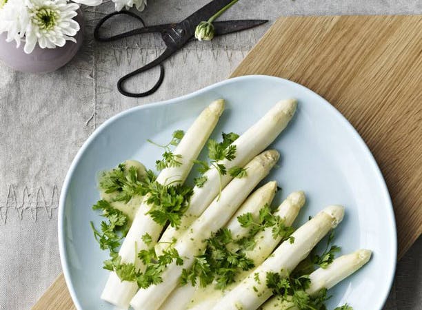 Asparges er også en af de råvarer, som er i sæson. Både danske og udenlandske asparges er bedst omkring maj og juni. Heldigvis kan du fryse de hvide asparges ned, når du har skrællet og blancheret dem i et par minutter. Fisk og krydderurter er der også masser af lige nu. Fx muslinger, torsk, hornfisk men også krydderurter, som mynte, persille og meget mere.