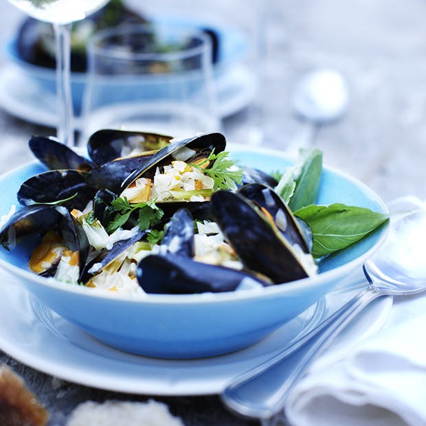 Opskrift på dampede blåmuslinger i cremet urtesauce. Se opskriften her