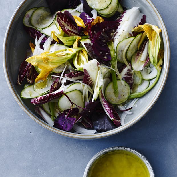 Opskrift på salat af radicchio, courgette, blomster og sennepsdressing. Se opskriften her