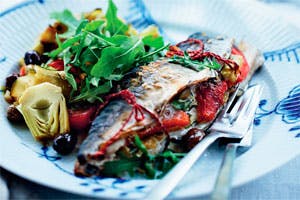 Er der fyld tilovers, så læg det mellem makrellerne i fadet. Drys fiskene med havsalt og friskkværnet peber og dryp med olivenolie. Bag det hele i ovnen i 10-12 minutter ved 200°.