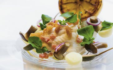 Servering: Anret den tilberedte fisk på 4 varme tallerkener og hæld en skefuld af brødsaucen over. Fordel kapers, løgringe, æbler, stegte svampe og vild brøndkarse ovenpå og server retten med de karamelliserede citroner som tilbehør.