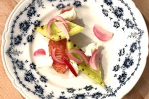Rimet laks med grillet agurk, syltet løg og rygeost