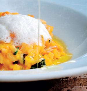 TIPS Den gule squash kan erstattes med Butternut-græskar/ squash, som bruges hyppigt i sæsonen i Californien. Den skal mørnes i skiver i ovn, inden den tilsættes risen.