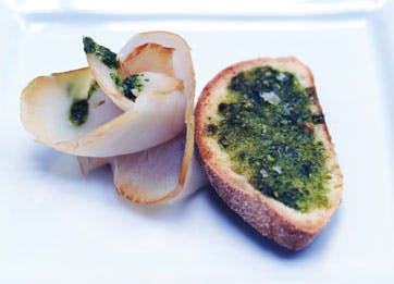 Rist brødet godt på begge sider, og smør et tyndt lag pesto på. Rul fisken i små tårne, og dryp med lidt pesto over.