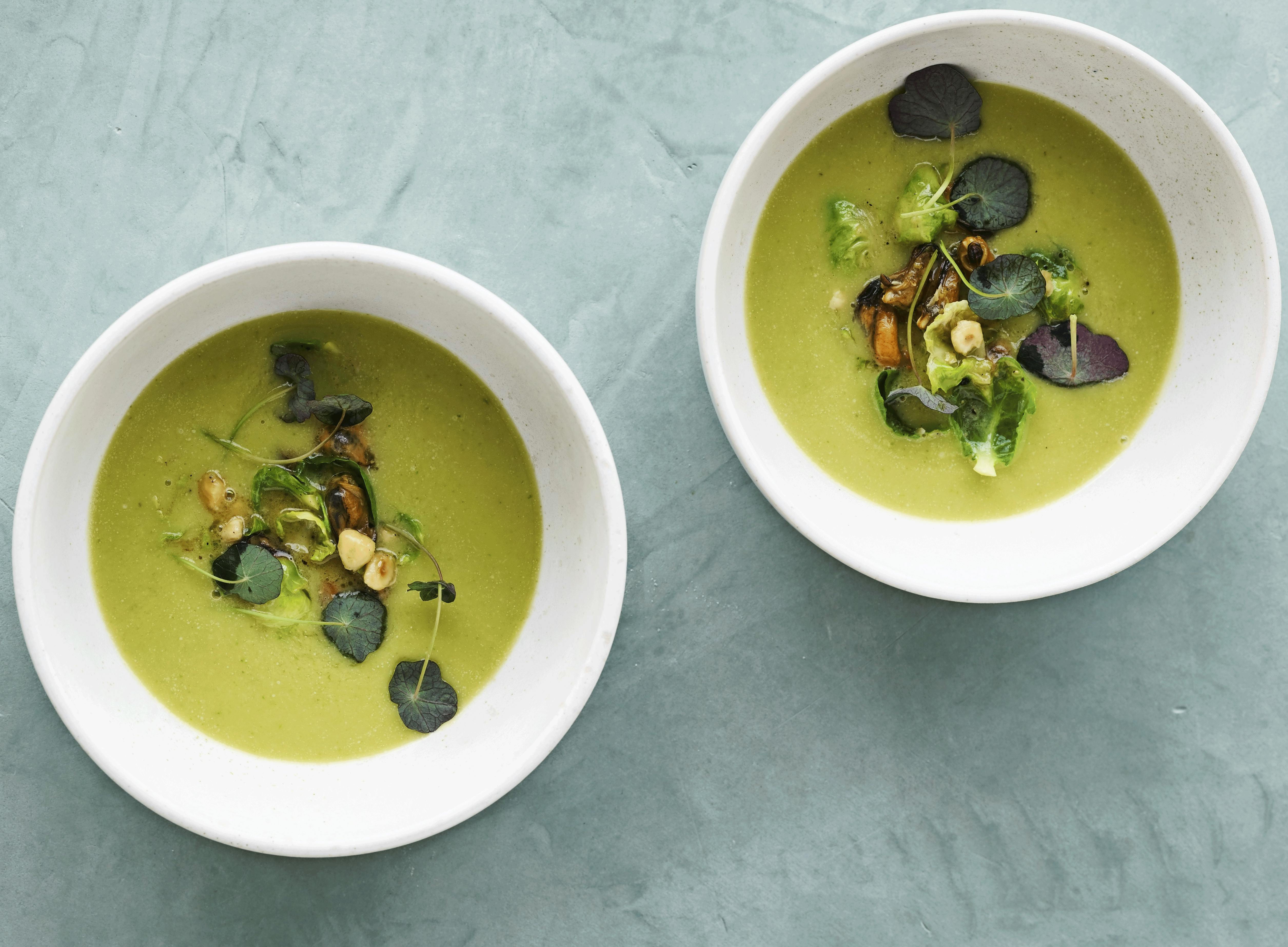 Du får her en lækker opskift på rosenkålssuppe med muslinger, rosenkål, peberrod og nødder.