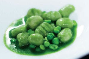 Opvarm ærtejuicen i en lille kasserolle sammen med grønsagsbouillonen, og pisk smørret i saucen. Anret gnocchierne i dybe tallerkener og hæld saucen over. Pynt med de hele ærter, og server straks.