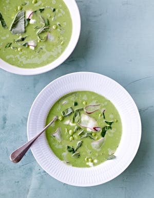 Det skal du bruge for at lave ærtesuppe med basilikum, radise og rygeost