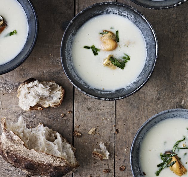 Savner du inspiration til den nye suppesæson? Her får du en vidunderlig cremet og velsmagende artiskoksuppe, serveret med muslinger vendt i ramsløg - den er som skabt til en kold og våd aften. Server den glohed og med et lækkert brød, og du har et kongemåltid.