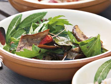 Vend skiverne på et fad med lidt balsamico, friskpresset hvidløg, salt og peber. Hak bladselleribladene groft og vend dem i aubergineskiverne. Andre blade el. salater kan også bruges.