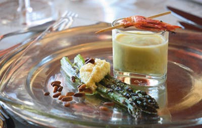 Anretning: Server aspargesene rygende varme med en skefuld af citronette-dressingen og et drys af pinjekerner. Aspargesene skal muligvis have lidt ekstra varme kort før serveringen. Server suppen for sig i en lille kop eller et glas ved siden af.