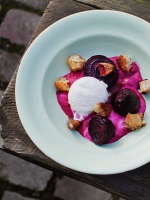 Anret de bagte rødbeder med rødbedecreme, hvidløgscroutoner og de lune pocherede æg, og server straks.
