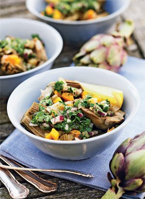 Fordel herefter artiskokkerne oven på de sauterede grønsager. Dryp lidt olivenolie hen over artiskokkerne. Hæld hvidvin på, drys med salt og peber og læg igen låg på gryden. Kog artiskokkerne for svag varme i 45-55 min. Hak rødløget fi nt. Skyl og slyng persillen. Hak den fint. Riv skallen af en citron. Bland løg, persille og citronskal. Anret artiskokkerne med grønsagerne og drys persilleblandingen udover. Server med citronbåde og et godt brød.