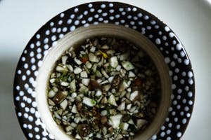 Læg de hakkede svampe i serveringsskåle, og hæld den kogende consommé over. Dryp suppen med nøddeolie og hakket sar.