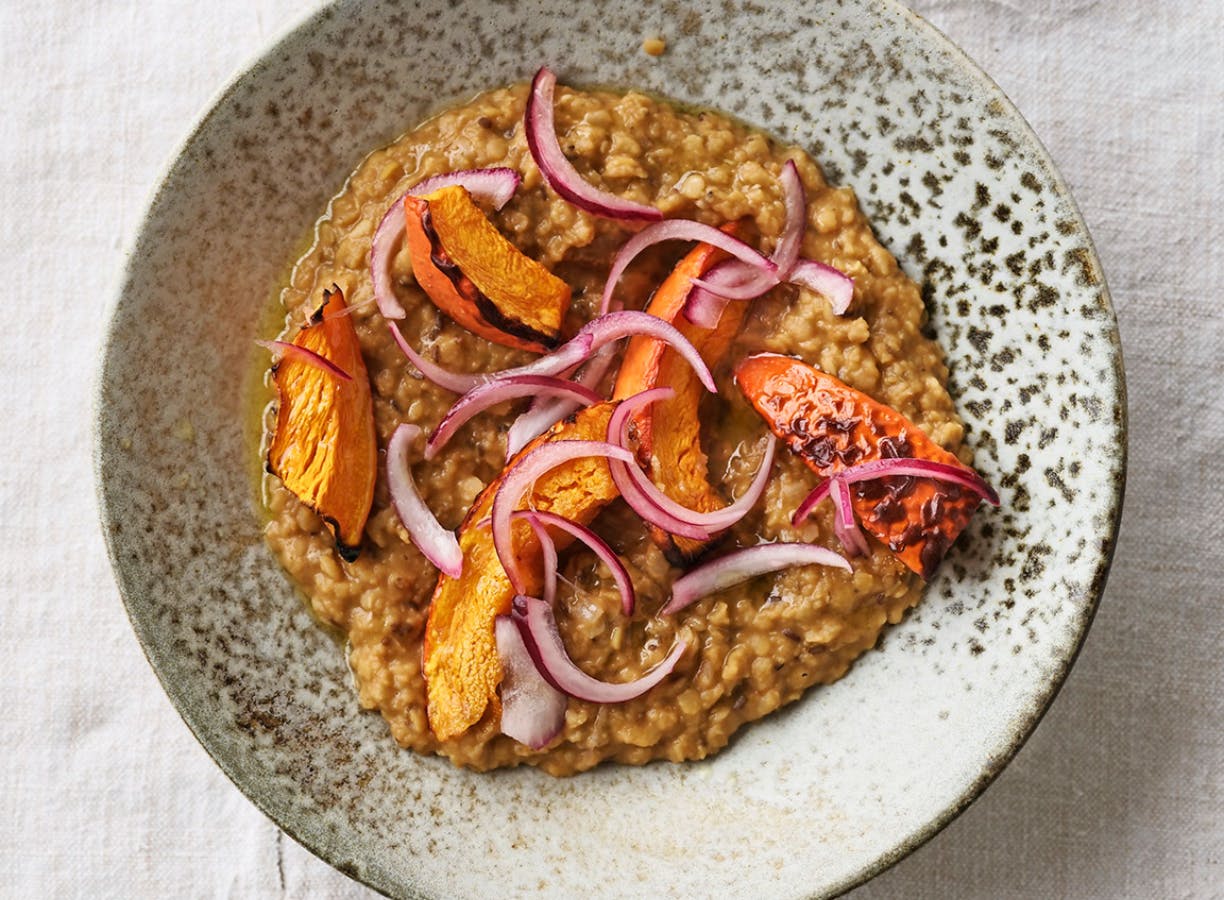 Dhal serveres ofte med raita, som er en agurkedressing, og koriander, men her får den et dansk twist med bagt græskar og syltede rødløg. Græskarrets sødme og rødløgenes syrlighed passer perfekt til den kryderede dhal. Som bonus giver det en ret med de flotteste, dybe farver!