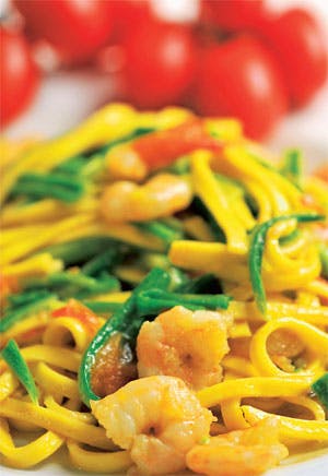 Hak løget fint og svits det på en høj pande sammen med olivenolien, de hele, pillede fed hvidløg og peperoncinierne. Skær de tre zucchine ud i tynde strimler a la julienne. Tilsæt dem sammen med lidt salt og tilsæt bagefter de grofthakkede cherrytomater. Lad retten simre i et par minutter, til grønsagerne er al dente. Til allersidst blandes rejerne i, og det hele røres rundt. Pastaen koges imens i saltet vand i tre-fire minutter og hældes derpå op i zucchinesaucen på panden og blandes godt. Saucen skal fremtræde cremeagtig. Er den for tør, tilsættes mere pastavand.