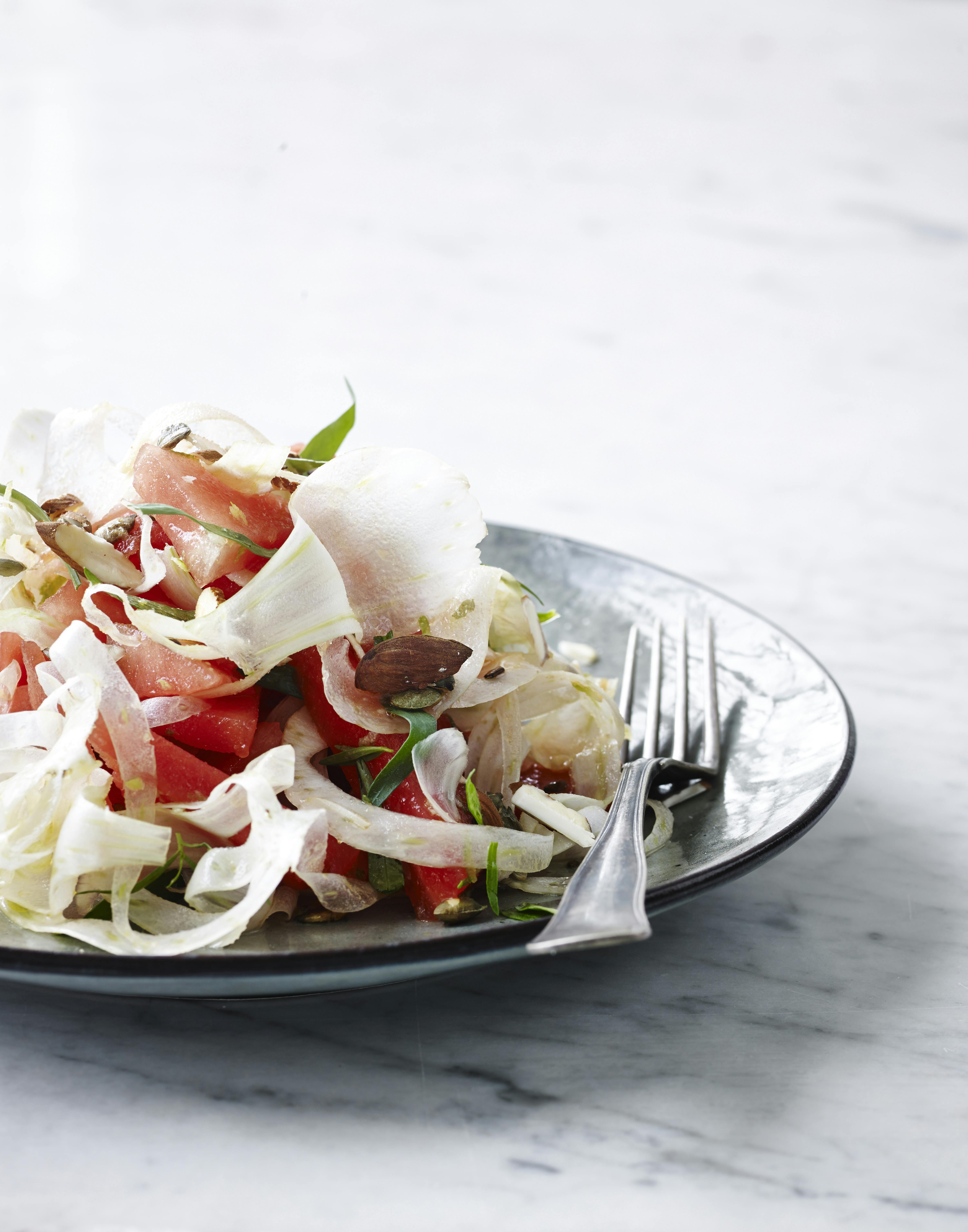 3. Bland melon og fennikel i en skål, og marinér med eddikke, olie, honning, salt peber og grofthakket estragon.