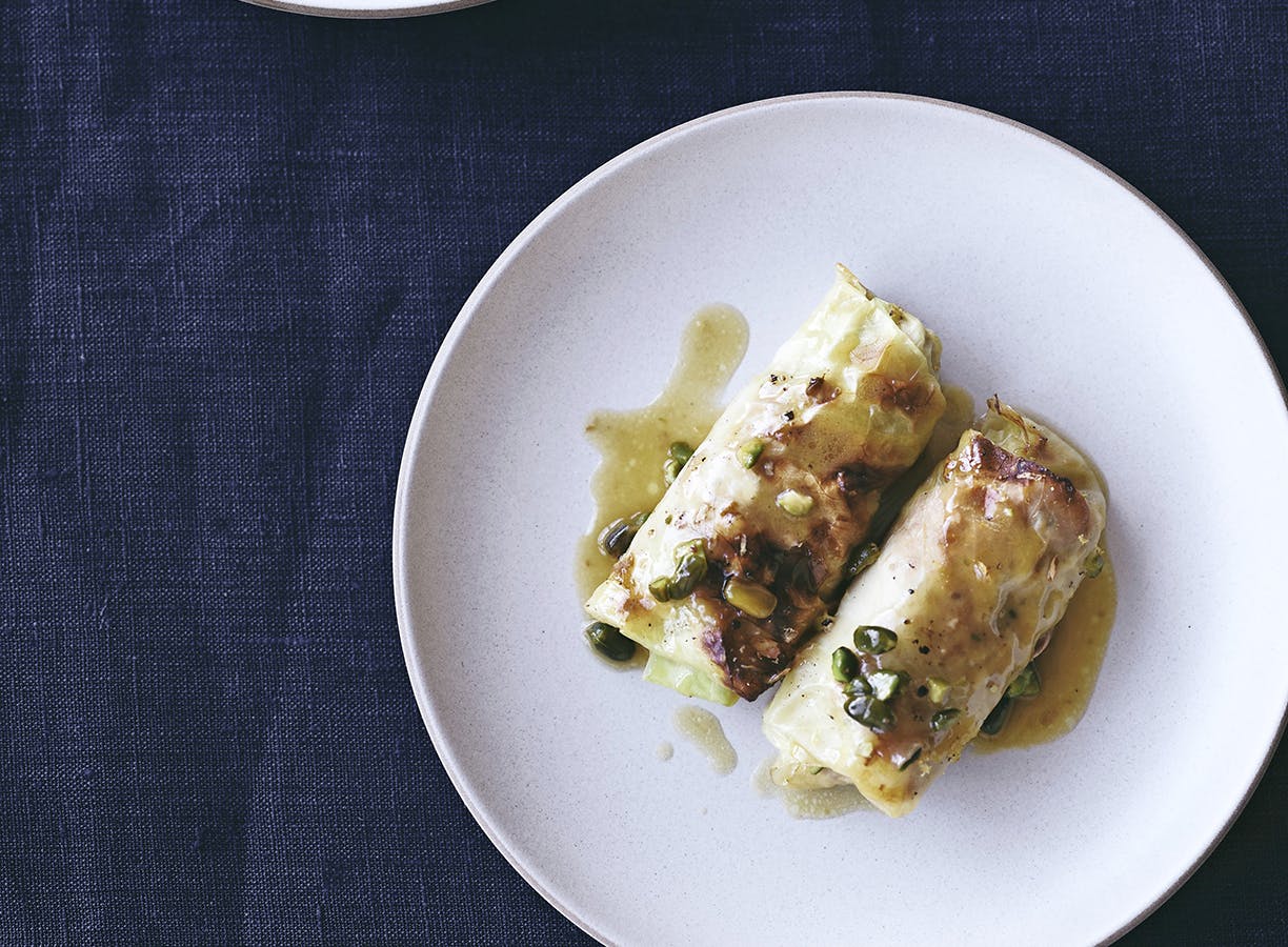 Dolmer er fyld, der er pakket ind i enten vinblade eller som her kålblade. Damp kålen kort tid, før du piller bladene af – så kan du nemmere få dem af i hele stykker.