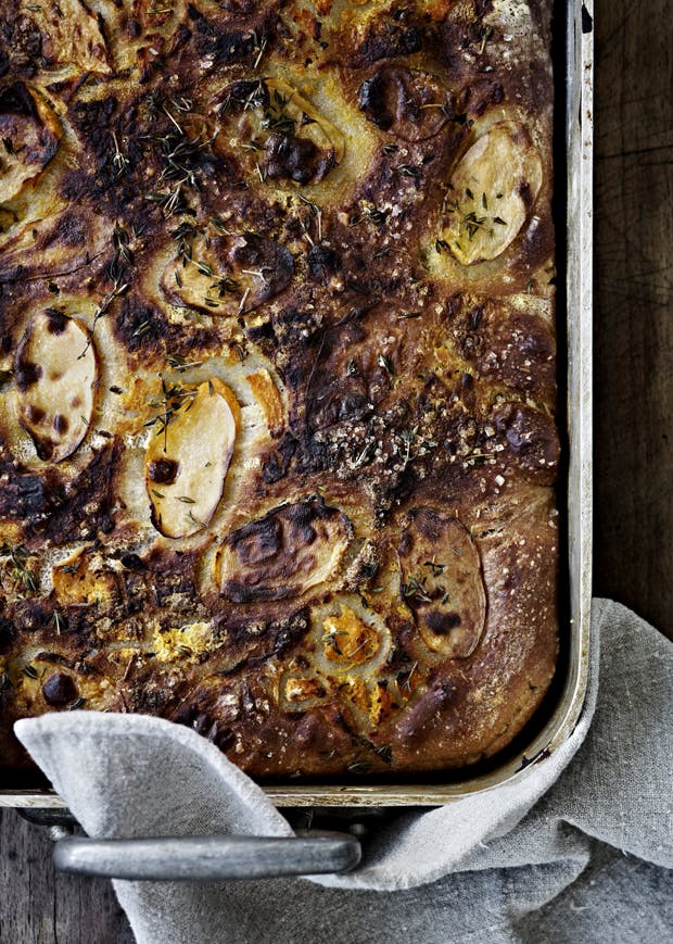 3. Fordel græskarmos over dejen i et tyndt lag, og fordel kartoffelskiver herpå, drys til sidst med hakket timian og havsalt, og dryp med lidt god koldpresset rapsolie. Lad foccaciaen efterhæve i ½-1 time.