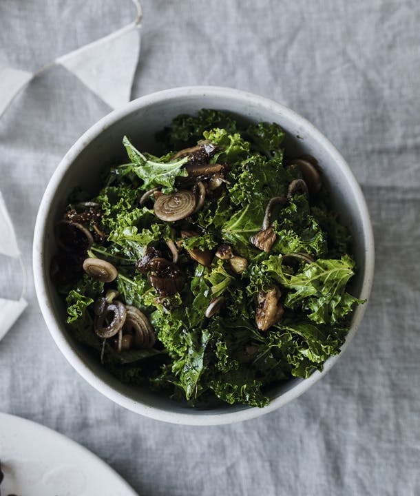 3. Pil skalotteløgene, og skær dem i skiver, hak valnødderne, og skær fignerne ud i tynde skiver. Hæld det hele op i skålen sammen med grønkålen.