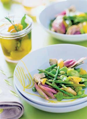 Bælg hestebønnerne. Skyl aspargesene. Fjern de nederste blade på artiskokkerne og fjern skægget. Skær artiskokkerne i kvarter på langs og dup dem med de halverede citroner. Pres saften fra de halverede citroner i en gryde med saltet vand og hæld både citronskallerne og artiskokkerne i gryden. Blancher i 4 min. Kasser citronskallerne, tag artiskokkerne op og læg dem til side. Blancher hestebønner og asparges i det samme vand. Halver de syltede citroner. Hæld olivenolie i en sauterpande og lad grønsagerne og citronerne simre let i ca. 10 min. De skal bevare deres sprødhed. Krydr med salt og peber. Server retten varm.