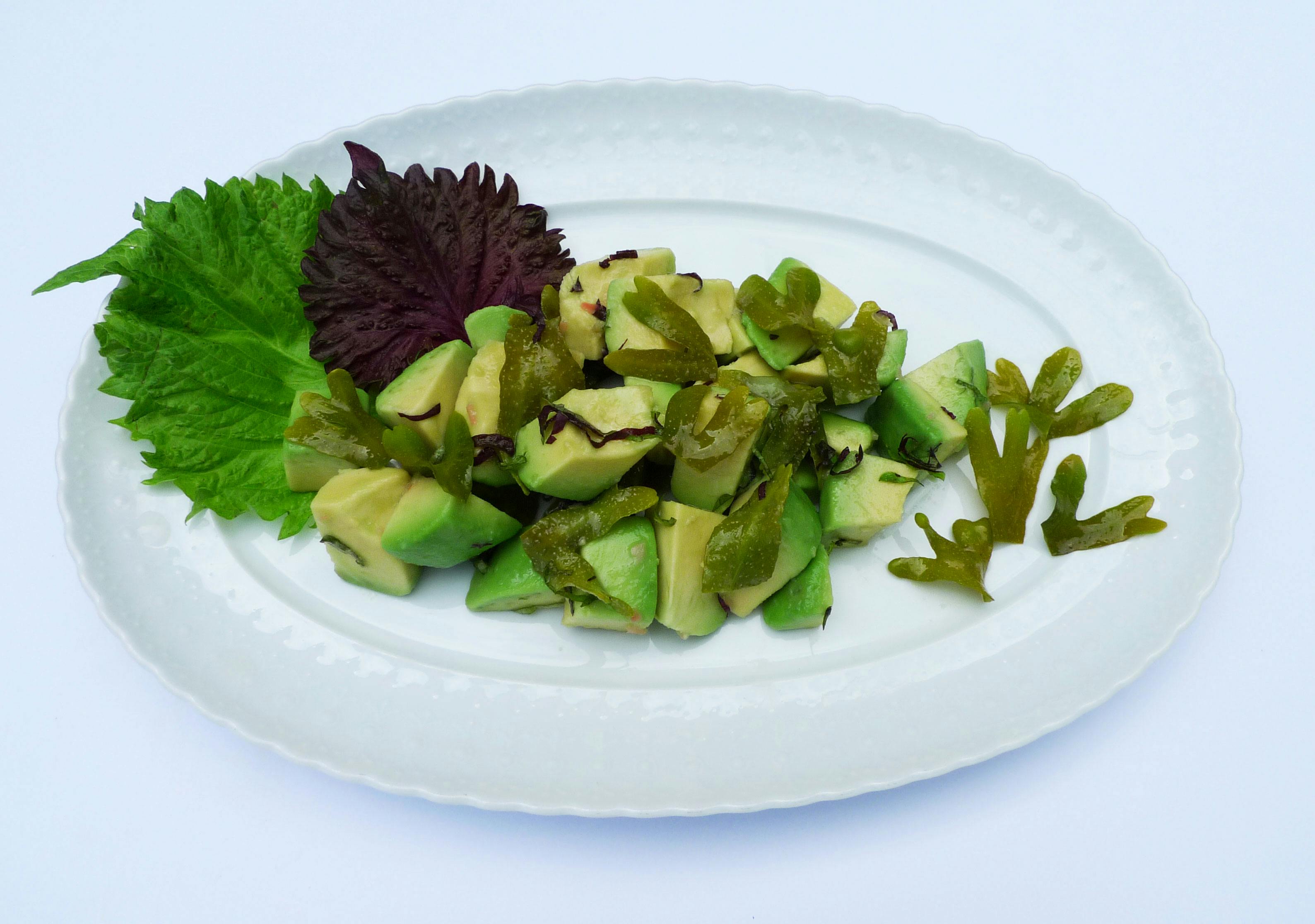 Frisk blæretang høstes i rent vand. De yderste skud, ca. 2-3 cm lange, evt. med blærer, klippes af og vaskes i saltvand. Skuddene blancheres i kogende vand ganske kort, hvorved de skifter farve fra gulbrun til lysegrøn (se billedet nedenfor). Skuddene afkøles i isvand, aftørres og lægges i lidt citronsaft. Avocado skrælles og skæres i terninger. Terningerne vendes i en lage af lidt wasabi-pulver opløst i saften fra syltet ingefær sammen med lidt hakket ingefær. Grønne og/eller lilla shiso-blade hakkes i stykker og vendes let med avocadoterningerne. Blæretangen blandes i og salaten serveres.
