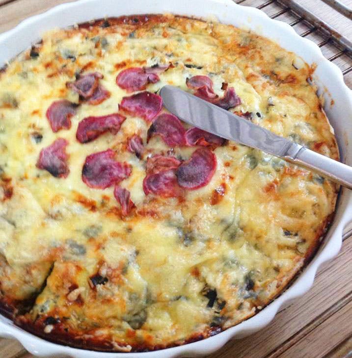 Tilsæt salt og vand. Saml hurtigt dejen og tryk den ud i en tærteform (ca. 22 cm i diameter).