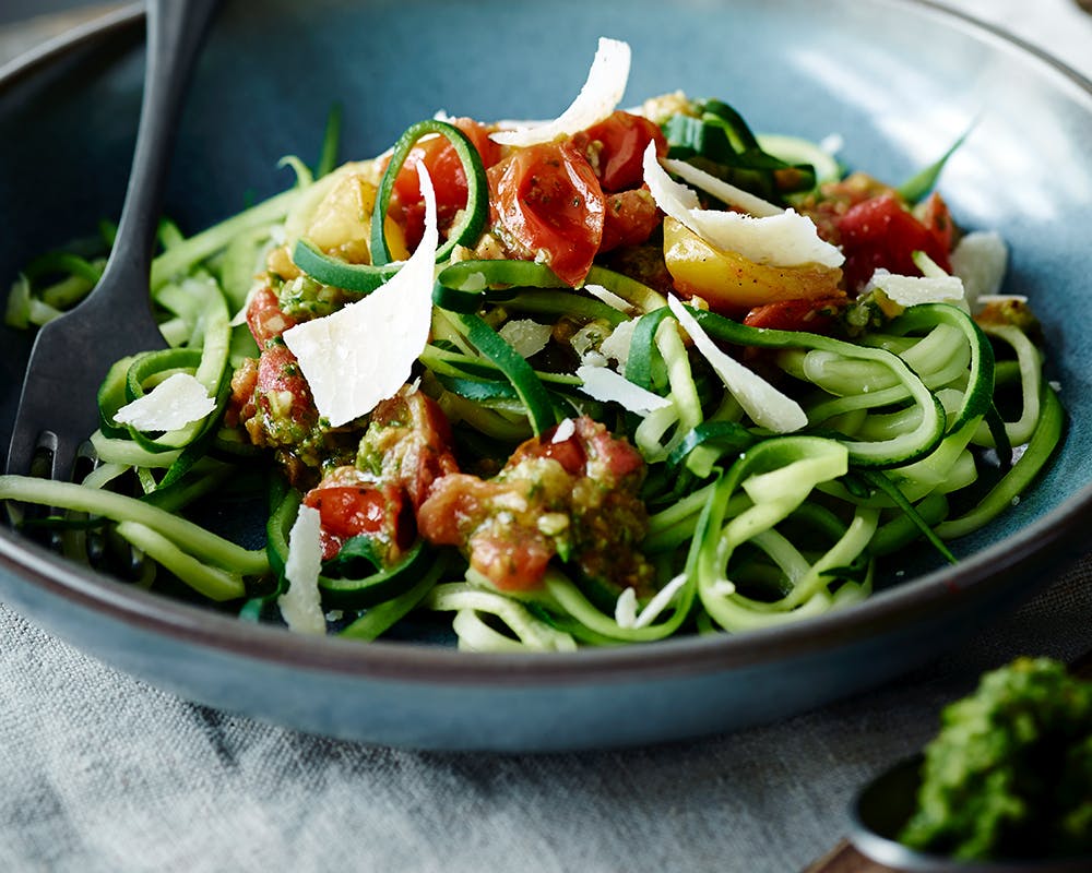 Grøntsagsspaghetti af squash med tomater og pesto