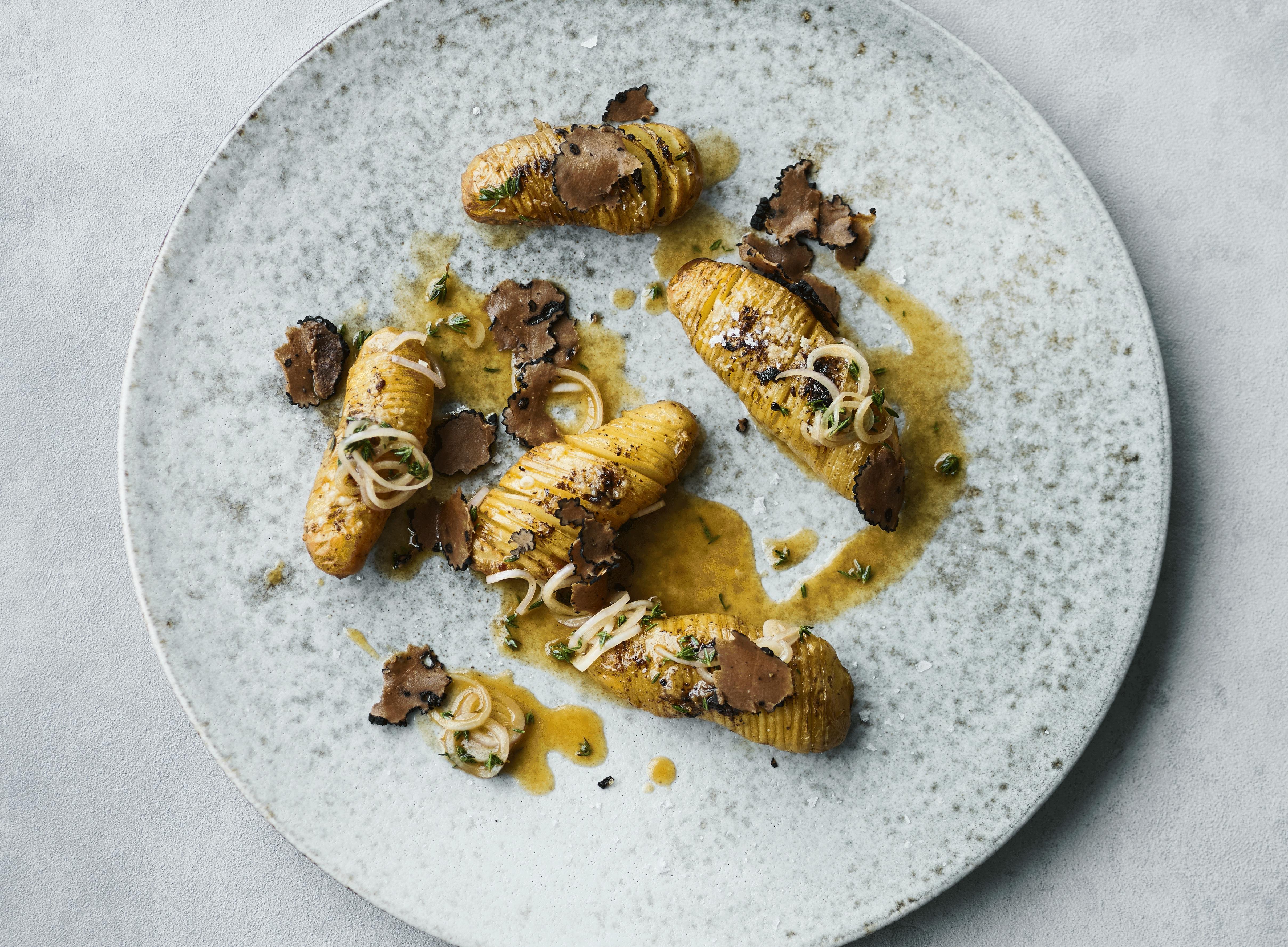 Det skal du bruge for at lave hasselback-kartofler med trøffel og sherrydressing
