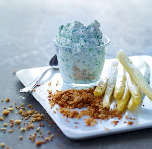 Server de hvide asparges på et fad med rygeostecremen ved siden af og en lille bunke brødkrummer.