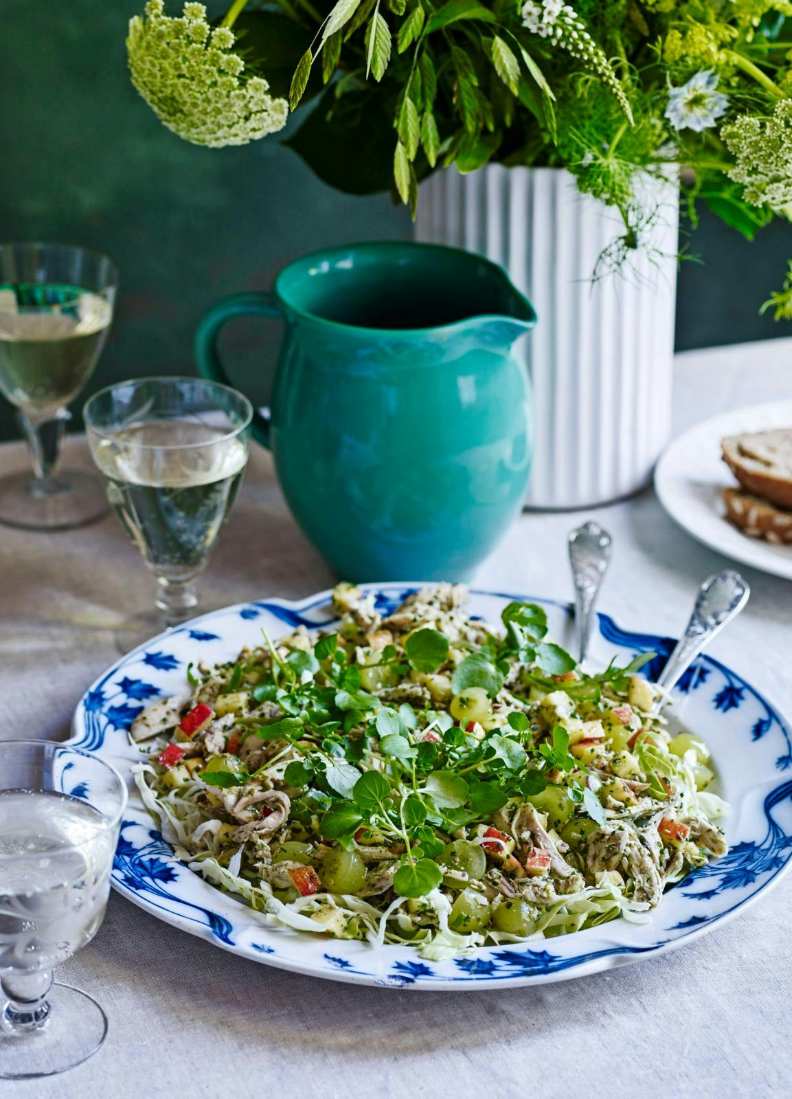 En kyllingesalat er en dejlig let og sund ret, der kan nydes både til frokost og aftensmad. Pep den op med vindruer, æbler og brøndkarse på toppen. Få opskriften her!