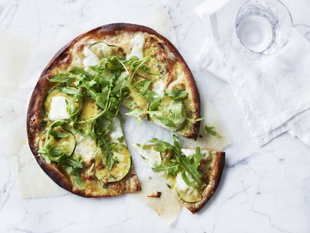 Lav en pizza med courgette og pancetta - en dejlig blanding af en mild grøntsag og saltet pølse, krydret med rosmarin, som smager fantastssk.