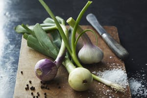 Løg er en af grundstenene i de fleste køkkener verden over og absolut uundværlig i de fleste madretter. Nye løg fås over sommeren og er fyldt med saft, kraft og skønne aromaer.