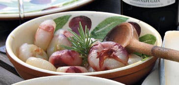 Kog løgene i ca. 2 min. Hæld vandet fra og kom løgene op i en skål. Smag dem til med olivenolie, lidt rødvinseddike, 1 friskpresset hvidløg, hakkede friske laurbærblade, salt og peber. Lad det trække før servering.