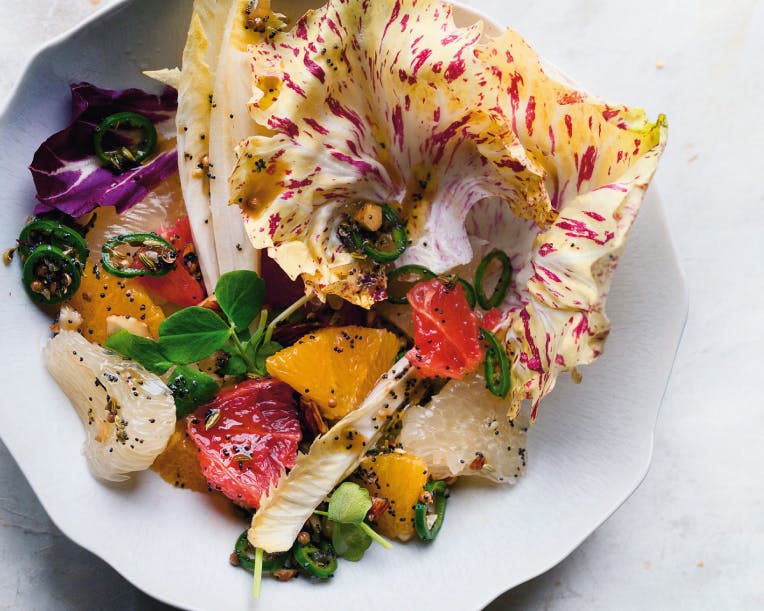 4. Skræl pomeloen med en kniv. Del frugten i både, og fjern forsigtigt de hvide hinder. Del bådene i stykker, og vend dem forsigtigt sammen med de øvrige citrusfrugter samt halvdelen af salsaen og begge slags salat. Anret citrussalaten på et stort fad, hæld resten af salsaen over, og server salaten.