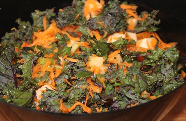 Hak det friske grønkål fint. Skær æbler, rødkål, forårsløg og tørrede abrikoser ud i små stykker og riv gulerødderne på et rivejern. Du kan riste pinjekernerne let på panden, hvis du ønsker dem mere sprøde. Bland alle ingredienser sammen i en skål. Tilsæt lidt olie og 1-2 tsk. honning for at tilføje sødme til grønkålens bitterhed.