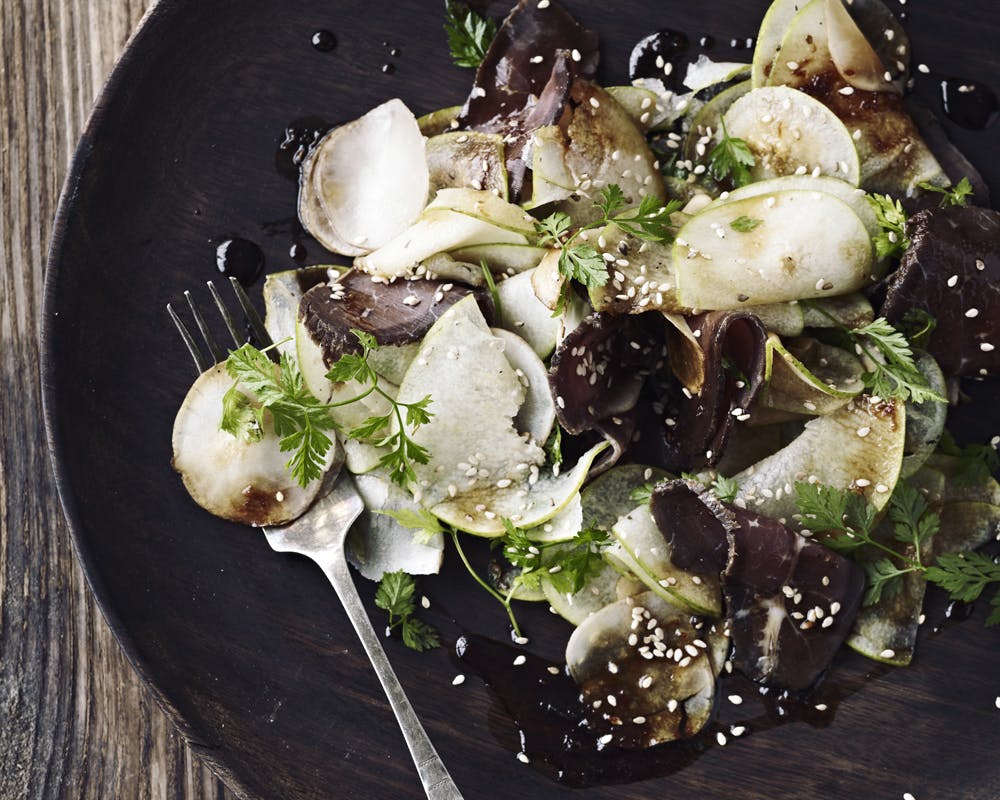 OPSKRIFT | Salat med ingefær og gravad oksefilet