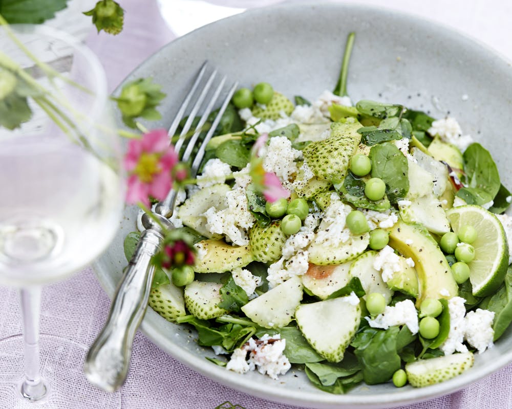 Frisk og sommerlig salat med et twist. De endnu umodne, grønne jordbær har en frisk, syrlig smag og et sprødt bid, som er skønt og anderledes i salatskålen og egner sig særligt godt som tilbehør til fisk og skaldyr.