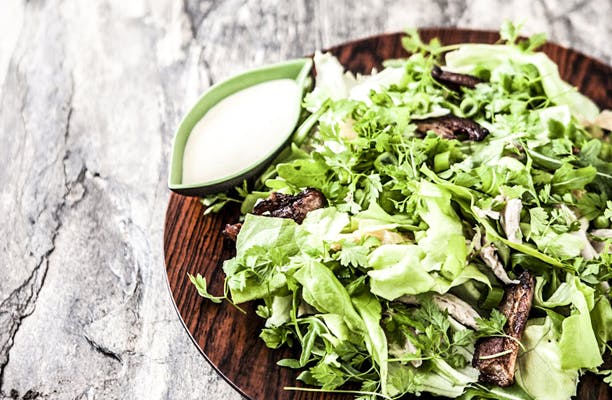 Skyl salaten grundigt og slyng den tør. Bræk den forsigtigt i mundrette stykker og fordel dem på et fad.