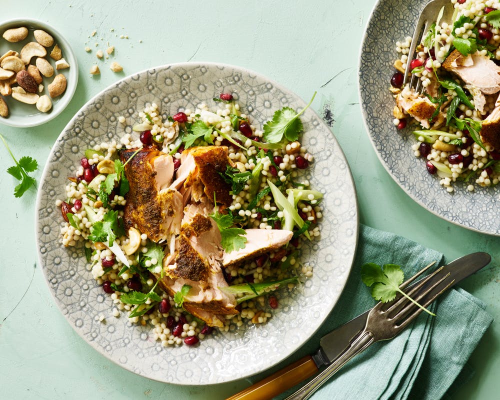 4. Bland couscous med granatæble, forårsløg, grofthakkede salte nødder og evt. plukket koriander. Servér den lune couscoussalat som tilbehør til den bagte laks.
