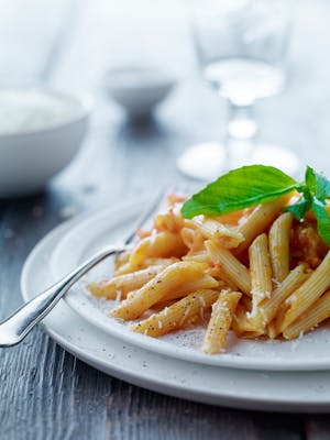Pasta Kog pastaen i saltet vand i 10 min. eller sådan at den stadig er al dente, med bid. Hæld vandet fra, og vend pastaen i tomatsaucen. Server straks med basilikum på toppen og friskrevet parmesan til.