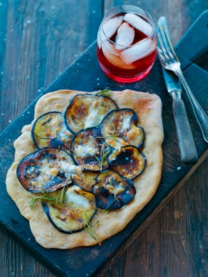 Skær auberginen i tynde skiver, og steg dem på begge sider i olivenolie. Drys med salt og peber. Rul dejen supertyndt ud til 4 pizzaer, og læg på smurte bageplader. Læg aubergineskiverne på dejen. Skær mozzarellaen i skiver, riv dem fra hinanden, og fordel dem over auberginerne. Drys med spidskommen, salt og peber. Bag din pizza ved 220° 15-20 min. alt efter størrelsen. 3