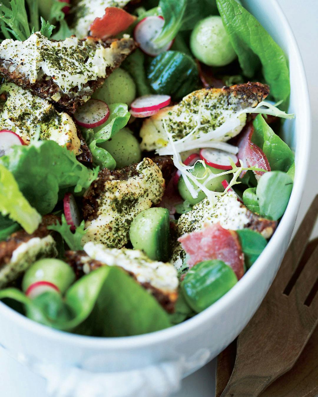 Prøv denne lækre salat med kalvebacon og croutoner af rygeost. Passer perfekt til hovedretten eller som frokost. Find opskriften her! (link fjernet)