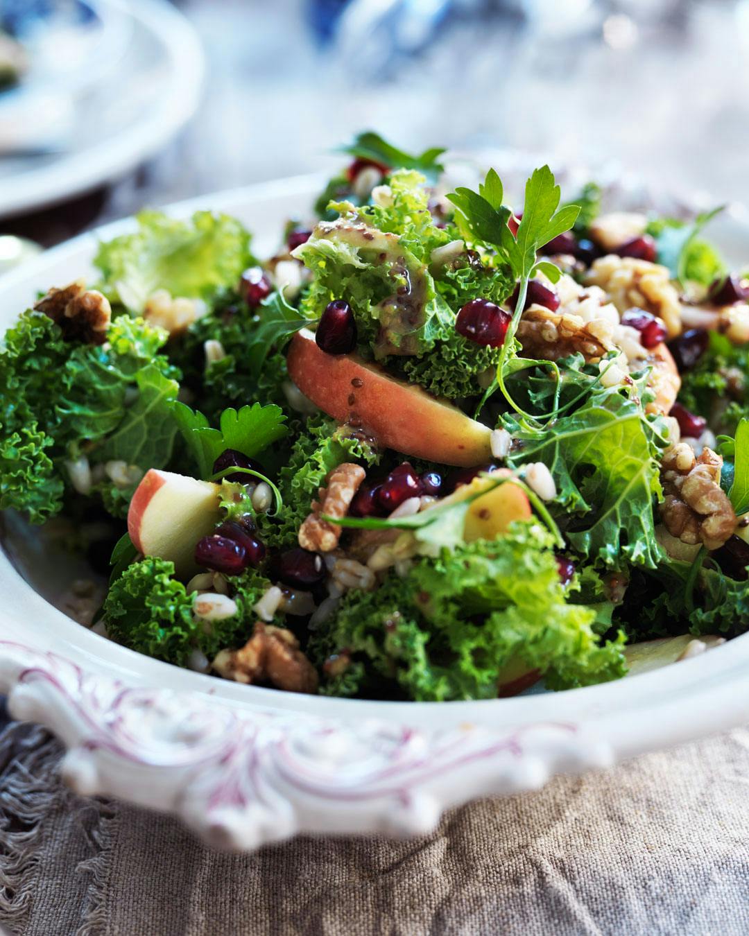 Denne fyldige salat kan nydes vegetarisk til frokost med groft brød til eller serveres som tilbehør til stegt kød eller fisk. Find opskriften her!