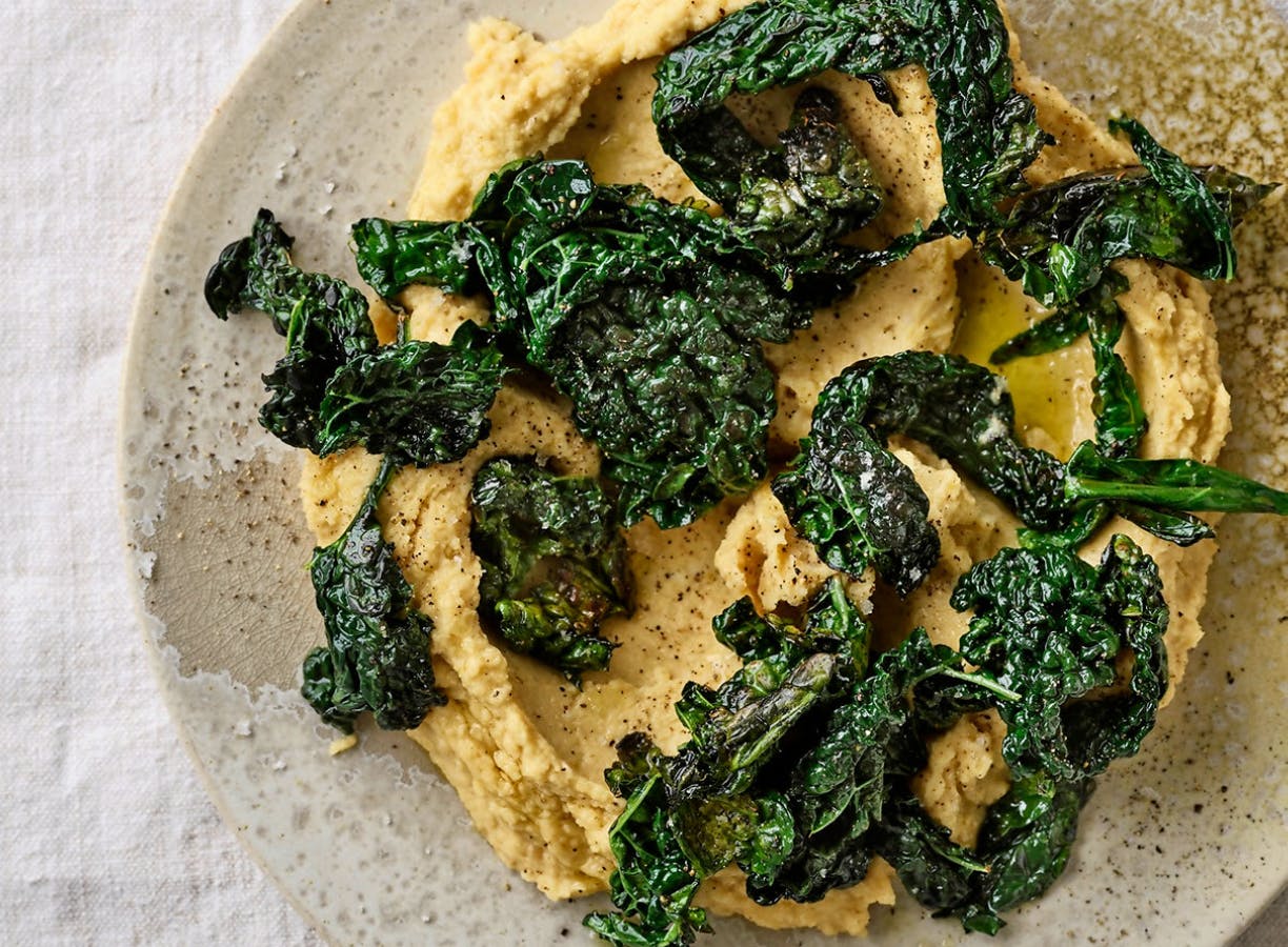Fordel den varme palmekål på toppen af puréen, og dryp med lidt ekstra olie.