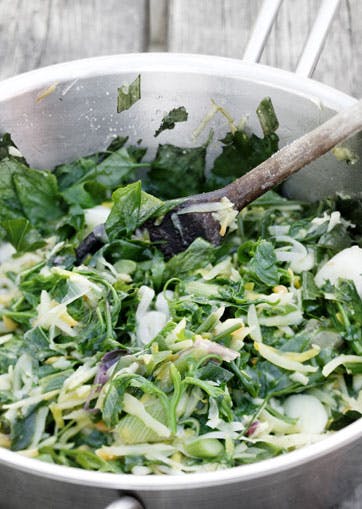 Smag citronsaften til med honning, salt og peber og hæld denne enkle dressing over salaten lige før servering. Pynt med gul snerre.